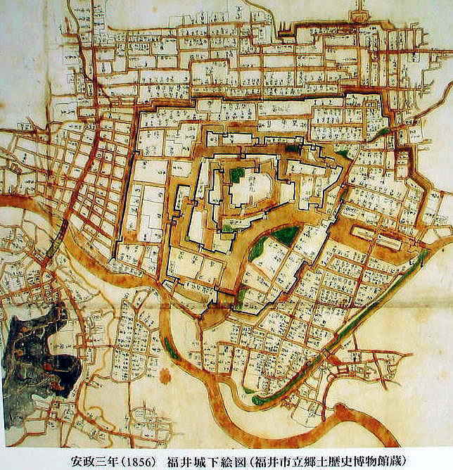 ■織田信長に越前支配を任された柴田勝家が築いた北庄城(きたのしょうじょう)はわずか1代8年で焼失。関ヶ原の戦い後、結城秀康(家康次男・北庄藩の藩祖)が越前に入封。旧城を改修し、新たな北庄城を築く。第3代藩主松平忠昌は城名を福居城(のち福井城)と改名。