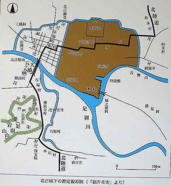 ■歴史織田信長は、一向一揆を壊滅させた直後の天正3年(1575)8月に越前49万石を柴田勝家に与えた。勝家は足羽川(あすわがわ)と吉野川との合流点に北ノ庄城を構築した。現在の柴田神社付近が本丸と伝えられる。天正9年(1581)4月、北ノ庄を訪ねて来た、ポルトガルの宣教師ルイス・フロイスは、本国あての書簡の中に「此の城は甚だ立派で、今、大きな工事をして居り、予が城内に進みながら見て、最も喜んだのは、城および他の家の屋根がことごとく立派な石で葺いてあって、その色により一層城の美観を増したことである・・・・」と報告している。 また、羽柴秀吉が勝家を攻めたときに、その戦況を小早川隆景に報じた天正11年5月15日付の書簡の中では、北ノ庄城について「城中に石蔵を高く築き、天守を九重に上げ候・・・・」と記しており、九層の壮大な天守閣であったことが知られる(天守復元イラスト図・現地説明板より) ![]() 勝家はまちづくりにも創意を施し、城下の繁栄のために一乗谷から社寺・民家等を北ノ庄へ移転させるなどに務めた。足羽川に架かる橋(九十九橋)を半石半木の橋に架設したと言われる。柴田勝家は今日の福井市の基礎を築いた人である。信長の死後の天正11年(1583)、勝家は賤ヶ岳の戦いで羽柴秀吉に敗れ北ノ庄に敗走、城に火を放って自刃した。妻お市は脱出を拒み、娘の茶々・お初・お江与を逃し、勝家とともに果てた。 <北庄から福井へ> 関ヶ原合戦の功により、家康から越前68万石を与えられた結城秀康(ゆうきひでやす)が初代藩主として入封し、旧北庄城本丸の北側に新城を築いた。本丸は柴田時代よりも北側に移し、4層5階の天守を造営した。本丸と二の丸の縄張は徳川家康がおこなったとも伝えられ、工事は6年にもおよんだ。 北庄藩は、「制外の家」として厚遇された。2代藩主忠直は松平姓に復姓し、3代藩主忠昌のとき、「北」は敗北に通じるとして、「北庄」を「福居(のち福井)」と改める。秀康没後は嫡子の不祥事によって減封を受けたが、断絶することなく、17代で明治維新を迎えた。 |