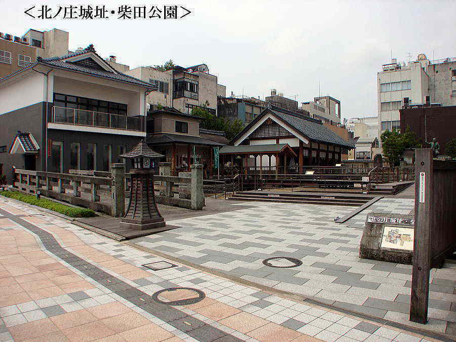 ![]() ▲左より、2階建ての建物は、休憩棟・展示資料館。その手前は九十九橋を本公園に再現。中央には柴田神社が建つ。この場所は、北ノ庄城の本丸跡と推定されている(平成22年6月再訪問) |