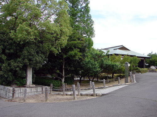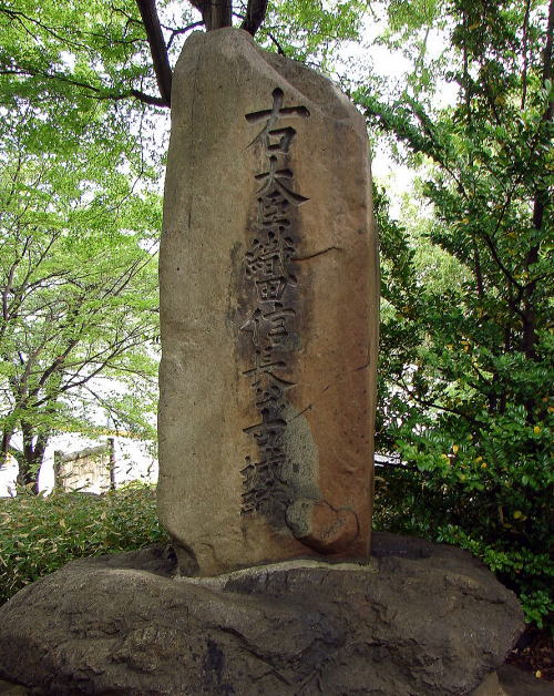 ![]() (写真上)五条川から見た清洲古城跡公園 左に清洲古城趾碑、右の建物は清洲ふるさとのやかた。さらにその右手には1996年(平成8)に五条川河畔で発見された野面積みの石垣が復元されている。清洲城が廃城となると、清洲城周辺はほどなく田畑に変わった。しかし、その後も清洲城の天主台址は尾張藩が管理。明治以降は宮内省付属地となったが、織田信長への正一位贈位を記念し、1922年(大正11)に清洲公園として開園した。 (写真右)清洲古城跡石碑 石碑には「右大臣織田信長公古城跡」と書かれている。 |