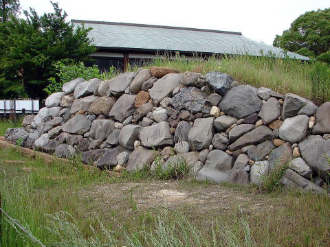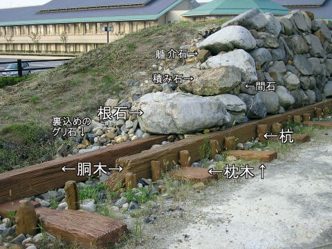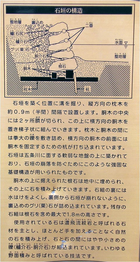 | 復元された本石垣は、平成8年に河川事業に伴い実施された遺跡調査により、清洲公園前の五条川右岸で発見されたもので、清洲越直前の本丸南側の石垣と考えられる。 石垣の基礎は、軟弱な地盤に耐えられる様に松材を用いた「梯子胴木」と呼ばれる構造になっており、石材はこの基礎の上に「野面積み」と呼ばれる戦国時代にかけて用いられた技法により積まれている。 ![]() 【メモ】木材は水に濡れると腐りやすいが、常に水に浸かった状態ではほとんど腐らない。特に松材は樹脂が多く水に強く、折れにくいので堀底の胴木としては最適である。しかし、堀の水が干しあがって胴木が乾燥すればたちどころに腐敗する。陸上の石垣には決して胴木を使ってはならない。 ![]() |