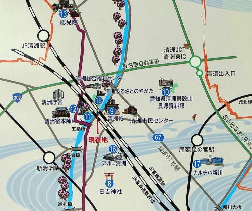 ■清洲城周辺案内![]() ![]() 清洲城の見どころは五条川をはさんで清洲城天主閣エリア、清洲公園エリア、清洲古城跡公園エリアの3か所に分かれる。金色に輝く鯱を屋根にいただく「清洲城天主閣」は、五条川に架かる赤い「大手橋」とともに清須市のシンボル。清洲公園には昭和11年、26歳桶狭間出陣の雄姿を模した信長公銅像が建てられた。清洲古城跡公園はかつての清洲城の天主がそびえていた旧跡で信長公を祀る社がある。 「清須越」が完了したあと、尾張の政治・経済・司法の中心は清須から名古屋へ移り、清須城とともにその城下町は歴史から姿を消し去りました。清洲城跡は新田開発され、地上の遺構のほとんどが失われた。現在、城跡は公園に生まれ変わり「清洲城天主閣」が再建整備された。清洲古城跡公園・清洲公園は散策自由。清洲城天主閣は入館料(大人300円)、開館時間AM9:00〜PM4:30、休館日:月曜日 (地図は現地説明板より) |