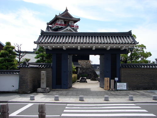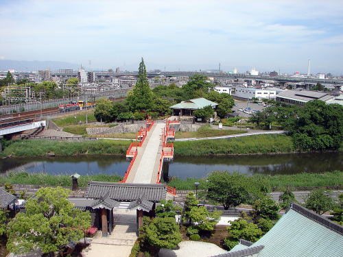 ![]() ▲清洲古城跡公園(清洲城天主閣展望室から望む) 写真手前の大手門をくぐり朱塗りの大手橋を渡った所が清洲古城跡公園。青屋根の建物は清洲ふるさとのやかた(無料休憩所) |