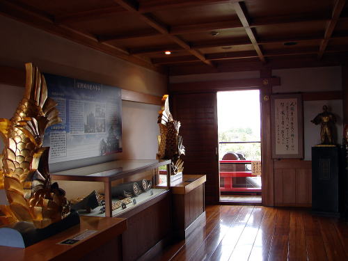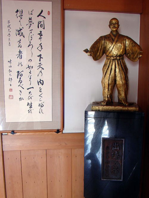 ![]() (写真上・右)天主閣4階 朱塗の勾欄廻廊造りの最上階は展望室となっており、眼下に新幹線・清洲の街並みや遠く名古屋城・小牧城が望める。 (右)桶狭間に出陣する前、「人間50年下天の内をくらぶれば夢もぼろしのごとくなり。一度生を得て滅せぬ者のあるべきか」と幸若舞(こうわかまい)の「敦盛(あつもり)」を舞う織田信長公像。桶狭間の戦いに勝利した信長公は、ここ清須から天下統一への第一歩を踏み出しました。桶狭間の戦いは、1560年(永禄3)5月、駿府から大軍を率いて尾張(愛知県西部)に出陣してきた今川義元を、織田信長が急襲、撃破した合戦。 |