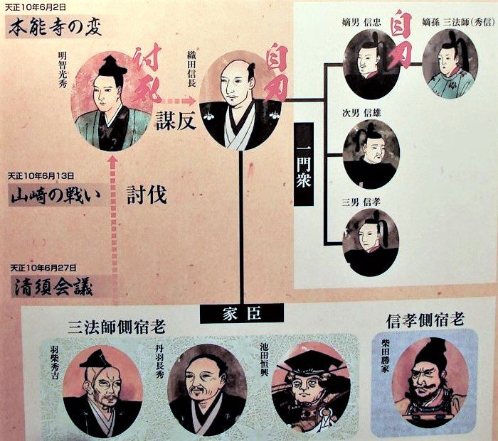 【清須会議前後の出来事】●天正10年(1582)6月2日早暁、信長公は京都本能寺で「是非に及ばず」の言葉とともに紅蓮の炎に焼かれました。毛利氏と対陣していた羽柴秀吉は明智光秀から毛利氏へ送られた密使をとらえ、すぐ毛利氏と和睦。6日に高松城を立ち、一気に帰京し(中国大返し)6月13日に山崎の戦いで光秀を打ち破ります。この時、四国方面軍の織田信孝、丹羽長秀、近畿の池田恒興など主な武将を取り込むことで勝利をつかみ、後の発言権を得ることとなりました。 ●京に帰陣できなかった柴田勝家は織田家の跡目を決める会議を開くことを提案し、6月27日清須城において清須会議が執り行われました。跡目候補の次男織田信雄は誰からも擁立されず、三男信孝は勝家が擁立しましたが、二人とも一時期他家へ養子に出されていたことなどを理由に跡継ぎ候補から外れます。 ●秀吉は信長公の嫡孫の三法師(秀信)を手なずけ、事前に上役の長秀を取り込み、山崎の戦いにも参戦した信長の乳兄弟で宿老ではなかった恒興を会議に参加させ味方を増やし、もう一人の宿老、滝川一益が戻らないうちに会議を始めたともいわれています。会議は秀吉の筋書き通りに進み、三法師を後継者に仕立て信雄、信孝は補佐役になることで決着します。結果、重臣筆頭勝家の影響力は弱まり秀吉が台頭していきます。この対立が翌年の賤ケ岳の戦いにつながり秀吉の天下へと時代は流れていきます。 ●賤ケ岳の戦いの後、信孝、勝家は切腹。一益は蟄居と没落していきます。信雄も後に秀吉の勘気に触れ他家預かりの身に、長秀は大大名になりますが次代に小大名へと没落、秀吉自身も滅亡したことで織豊時代が終わり、徳川の世へと移り変わります。本能寺の変で信長公、嫡男信忠公を失ったことで戦国最強の覇者、織田家とその家臣団は一気に瓦解したのです。 |