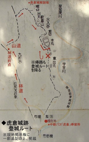 ![]() 写真は、右の「虎倉城跡登城ルート図」現在地周辺の風景 県道31号線を吉備中央町に向かって進む。岡山市北区御津虎倉にある虎倉トンネルを、くぐらずにすぐ手前を市場集落方向へと左折。宇甘川に架かる常磐橋をわたり右に曲がった所がこの写真場所となる。 中鉄バス「虎倉停留所」そばの三十番神社には、虎倉城跡への登城ルート(右の登城ルート図)や城の沿革を示す簡単な案内板が立っている。虎倉城跡へは、山側に向かって谷川沿いの林道を登って行く。 |