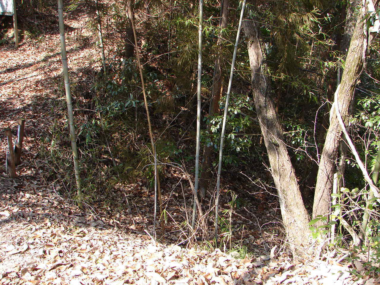 ![]() 東二の丸跡 本丸東側の東二の丸跡は竹藪等で覆われ、周囲は断崖絶壁でもあり、足を踏み入れるのは危険。 |