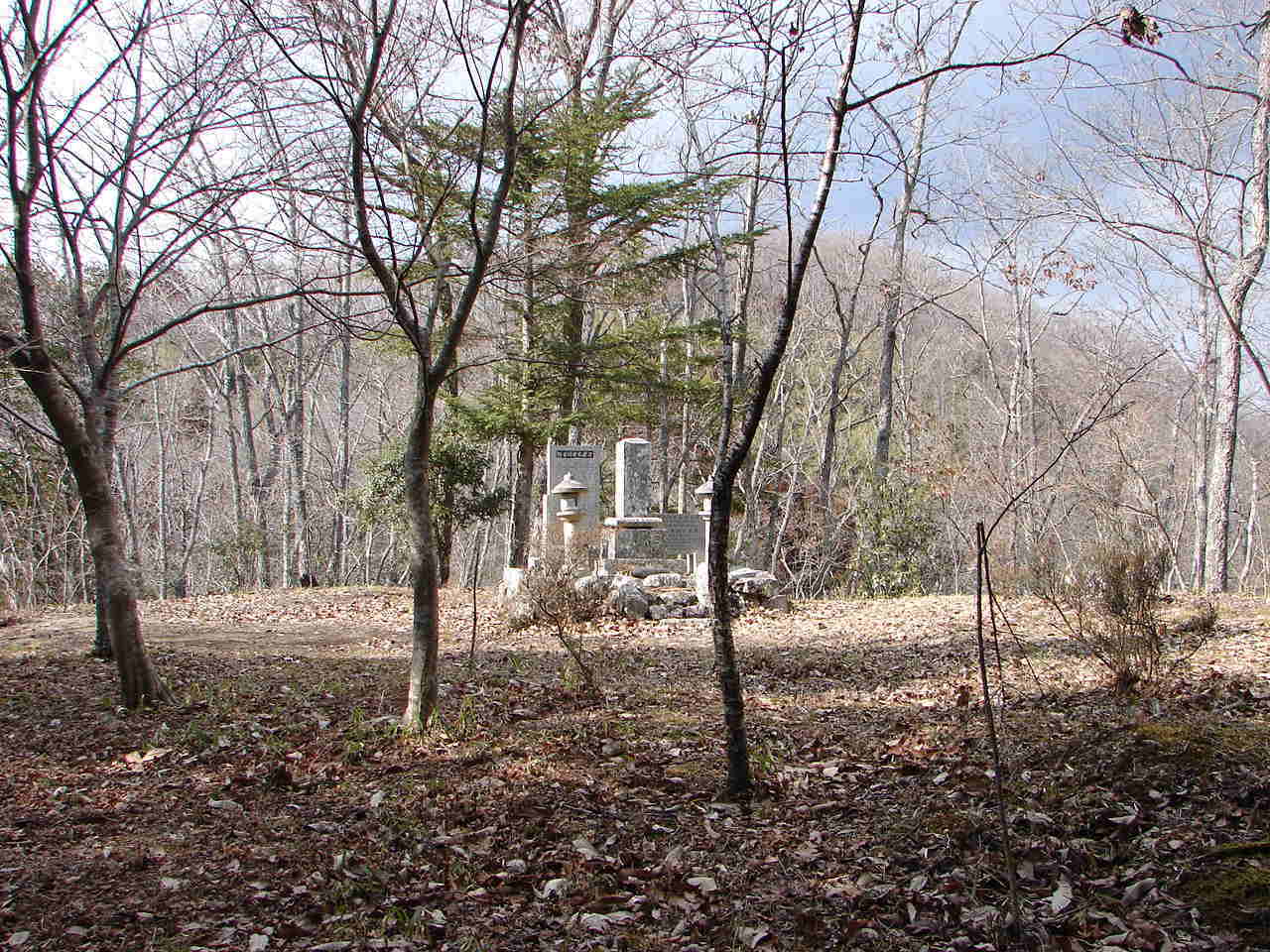 ![]() 西出丸跡に建つ伊賀氏の供養塔 城主伊賀氏家臣の末裔が建立。この西出丸跡を下って、およそ東に平坦な道を100m進むと空堀に辿り着く。 |