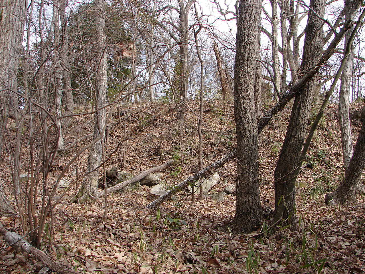 ![]() 石積 本丸跡の西側面に見られる石積の痕跡。 |