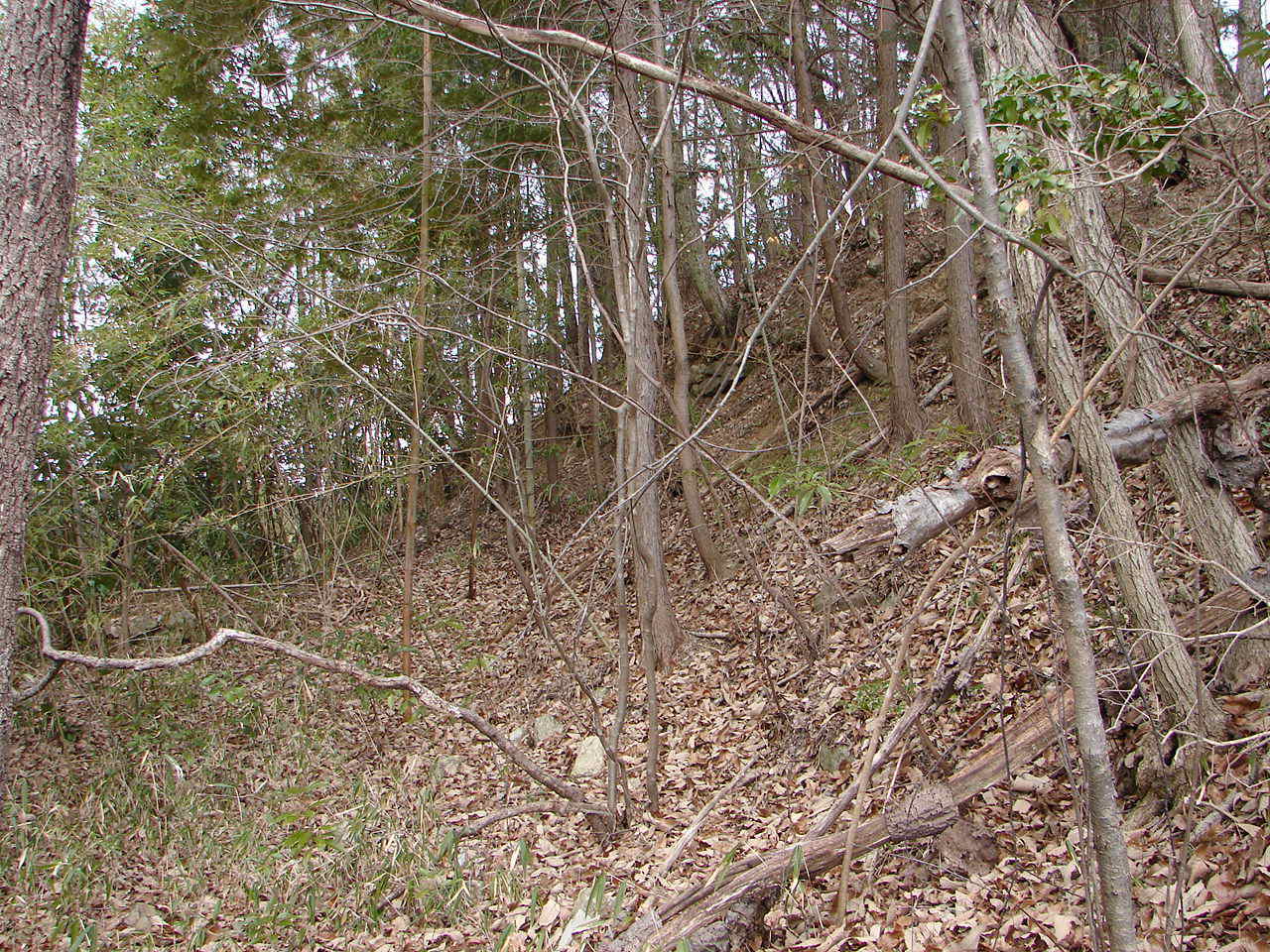 ![]() 本丸跡の西側側面 西二の丸跡と同じく切岸状態に築造。上面には削平された本丸跡が広がる。空堀を経て西に回りこんで登るとこの場所に至る。更に進むと右写真へと続く。 |