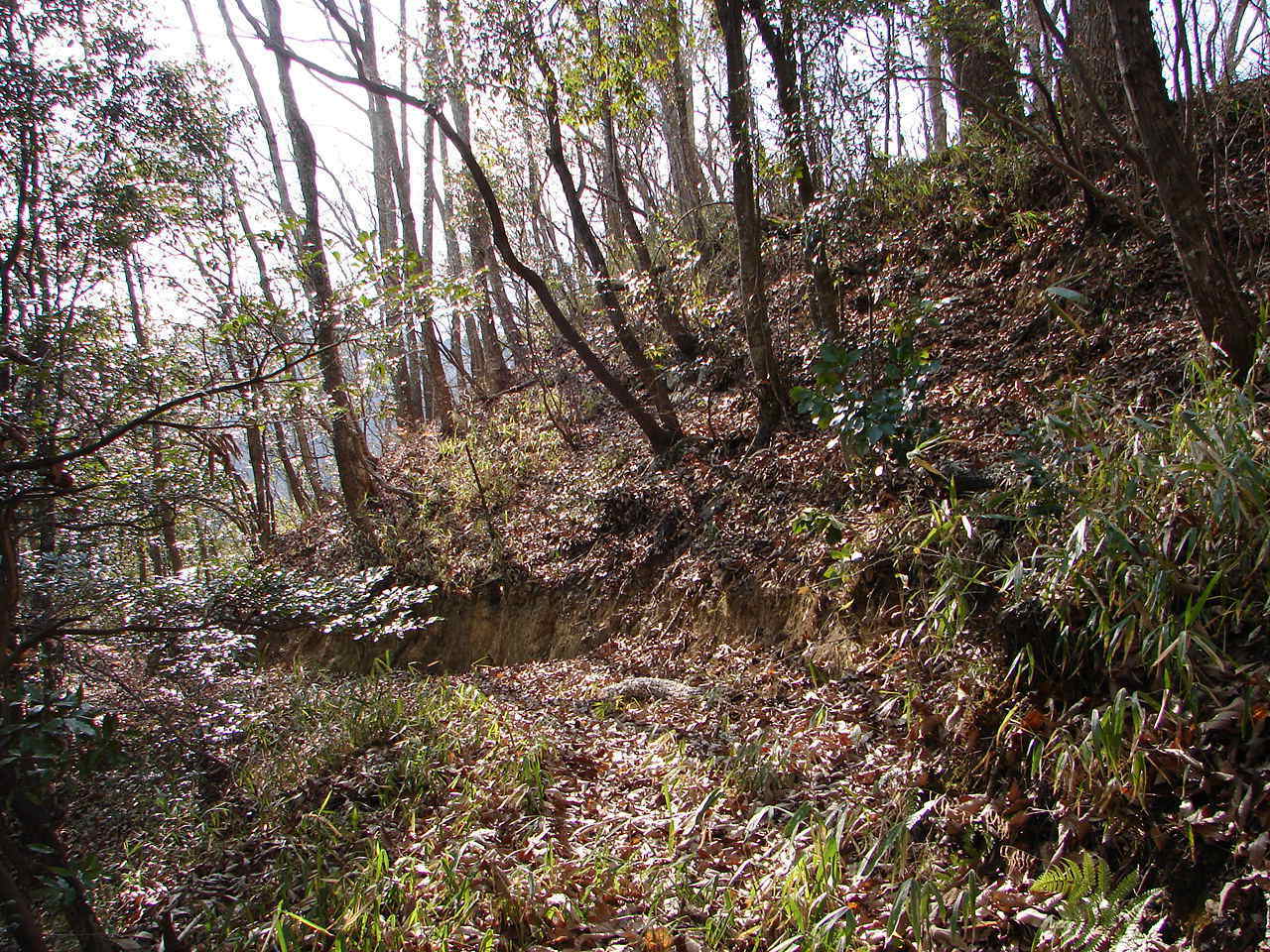 ![]() 三の丸跡西側の この空堀の形態は堀切のタイプになる。ここで行き止まりかと錯覚しますが、本丸跡へは、空堀の底を前方へと進む。 |
