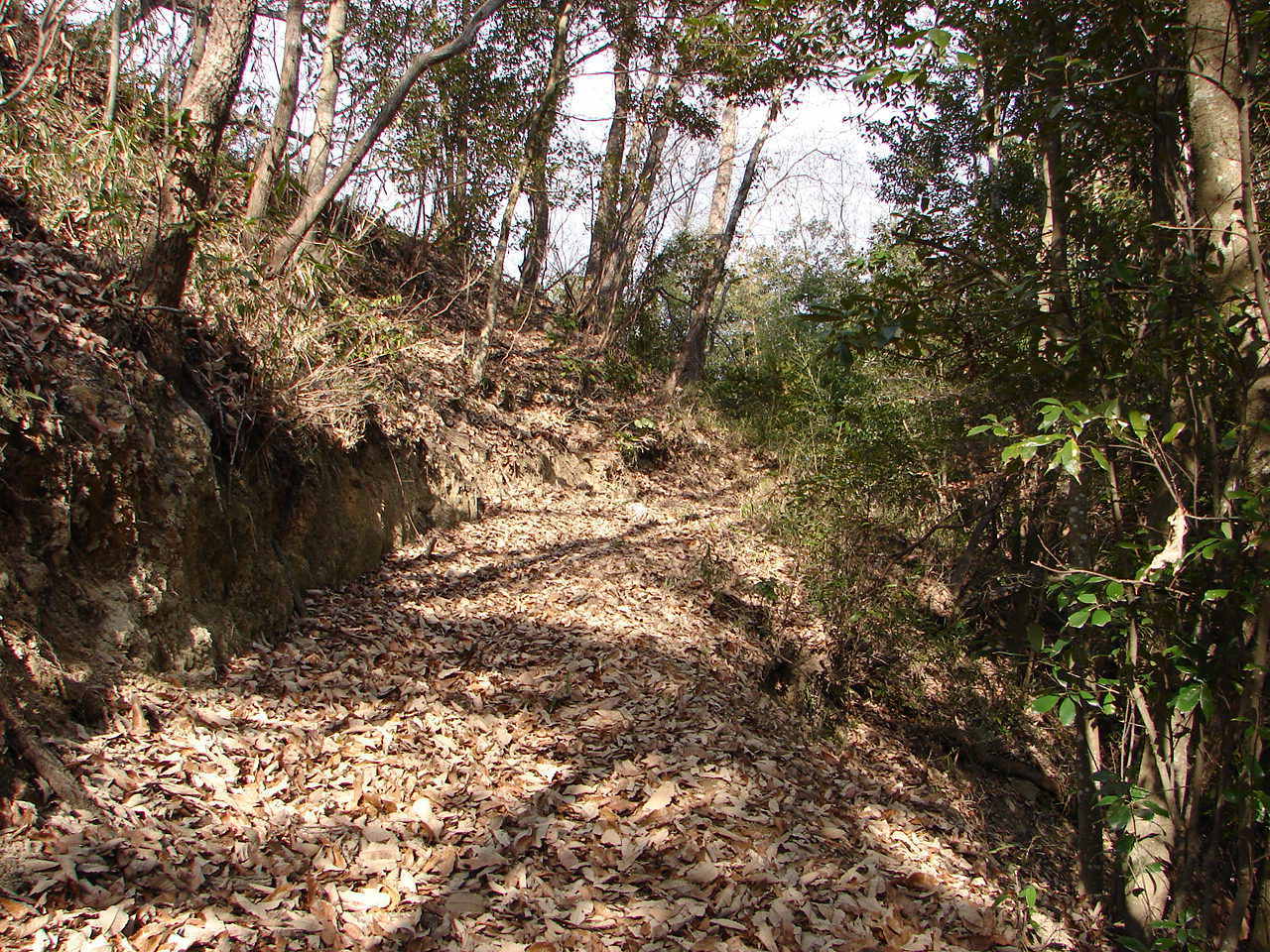 ![]() 虎倉城入口 土橋・堀切の場所から「西出丸」に至る坂道。頂上が西出丸跡となる。城域はここから東方向にほぼ一直線に西出丸跡・三の丸跡・西二の丸跡・本丸跡へと続く。さらに本丸の東には東二の丸・東出丸が築かれている。 ここでは、便宜上、本丸の西にある郭を西出丸・西二の丸、東にある郭を東二の丸・東出丸としました。 |