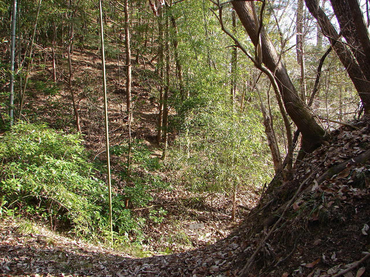 ![]() 西二の丸跡より見下ろす三の丸跡 虎倉城は、他の山城と同じように段々畑状に郭が築かれており、当然、三の丸跡は西二の丸跡より一段下になる。 |