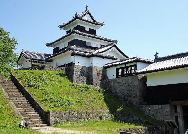 ![]() 三重櫓(復元) 本丸の北東隅に建つ三層三階の櫓で、小峰城の中心となる最も規模の大きな櫓です。高さが約13m、一階が約12m四方、二階が約8m四方、三階が約4m四方の正方形となっています。外観は黒塗りの板を張った「下見板張」で、耐久性が高いとされます。 |