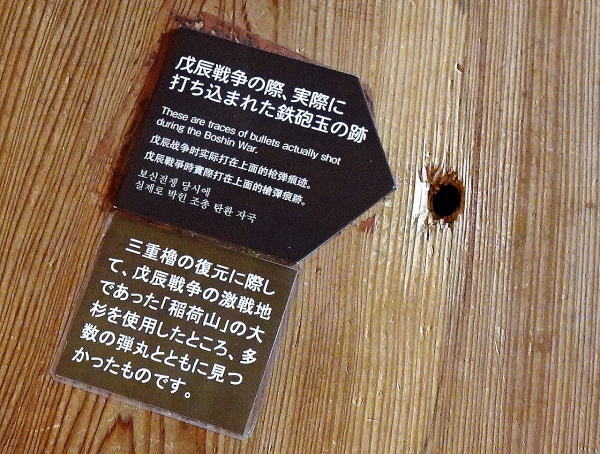 ![]() 鉄砲玉の跡 三重櫓復元に使用された大杉に打ち込まれた鉄砲玉の跡。 |