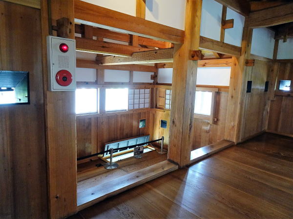 ![]() 三重櫓内部 張り出した土間が設けられており、「石落し」や「狭間」も設けられている。 |