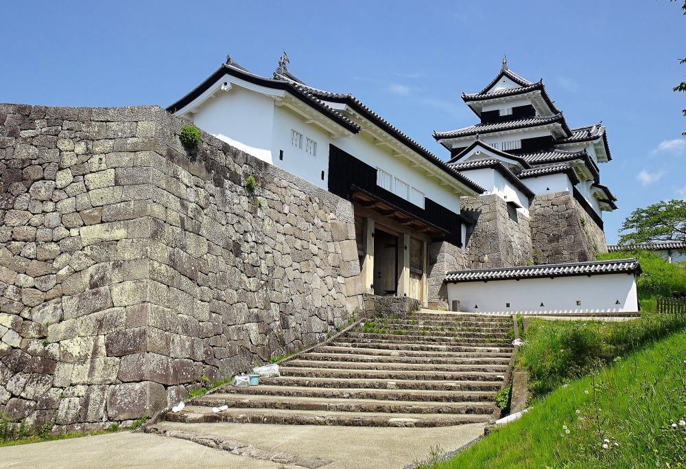 三重櫓西側の土間に出入口があります。石段を上がったところになります。三重櫓に使用した瓦は1万3千枚を超える膨大な数だったことが記録に残っています。 |