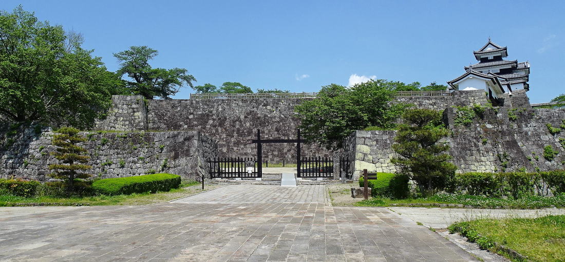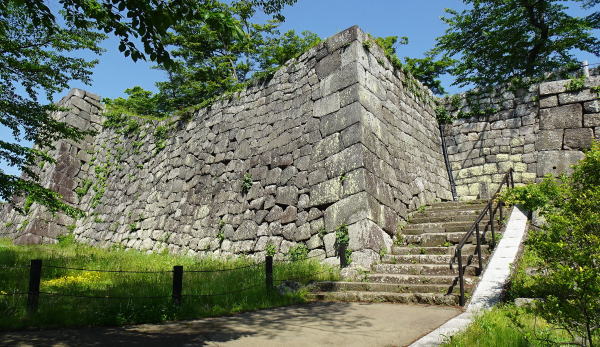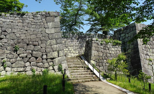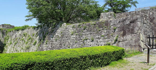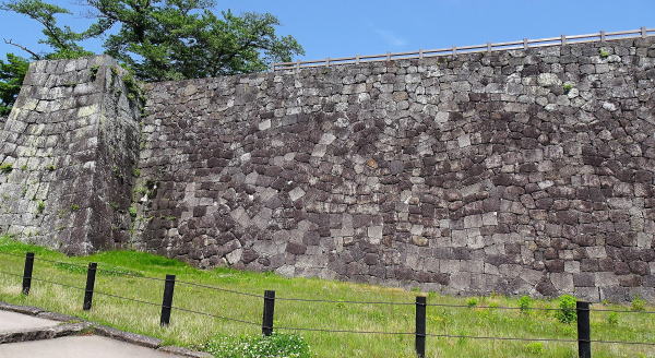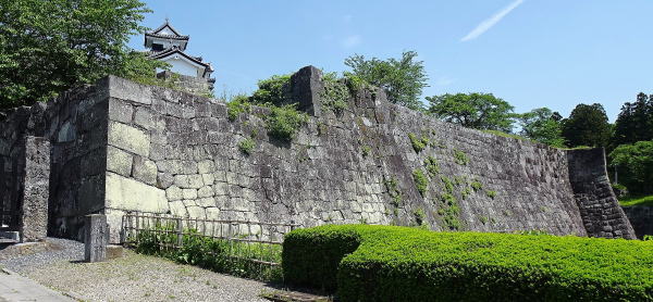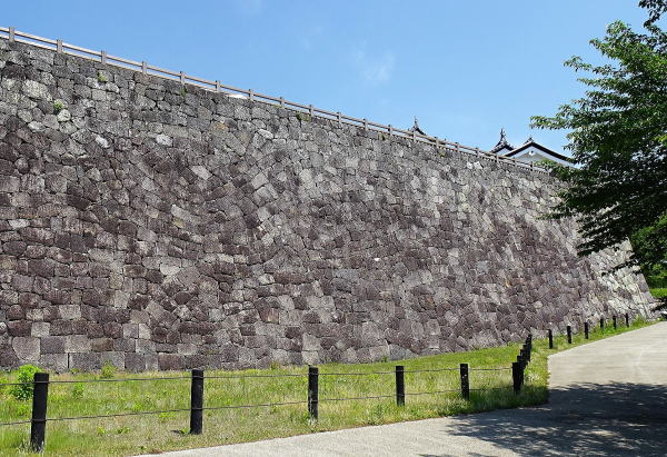 ![]() 清水門を入ったすぐ前の高石垣(半同心円状) 清水門から左方向に展開する石垣。左端は桜之門跡。 【小峰城の石垣】小峰城に石垣が積まれたのは、江戸時代の初めの会津藩支城時代のときです。主に本丸に積まれていたようで、この時期の石積みの跡は、三重櫓の北面の石垣で確認することができます。 寛永4年(1627)に白河藩が成立し、初代白河藩主となった丹羽長重は、寛永6年(1629)から約4年をかけて、城郭の大改修を行いました。長重による改修の特長は、本丸・二之丸を総石垣造りにして、三之丸の各所の門付近にも石垣を築いたことがあげられます。 明治時代以降、本丸・二之丸を除く大半には、官公庁や住宅、線路・駅舎が造られ、多くの石垣は壊されました。それでも現在、本丸を中心に約2qの長さの石垣を確認することができます。 今残る石垣は、江戸時代から現代まで何度も修復が行われました。そのため、石垣を観察すると、様々な積み方の石垣を確認することができます(現地説明板より)。 |