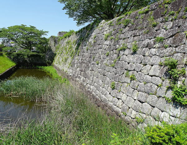 ![]() 清水門脇の石垣と水堀(西側) 手前側の石垣の積み方は、「打込ハギ布積み」で、大きさがほぼ同じ石材を用い、横方向に目地が通っています。奥側にはまた別の積み方の石垣も見られます。 |