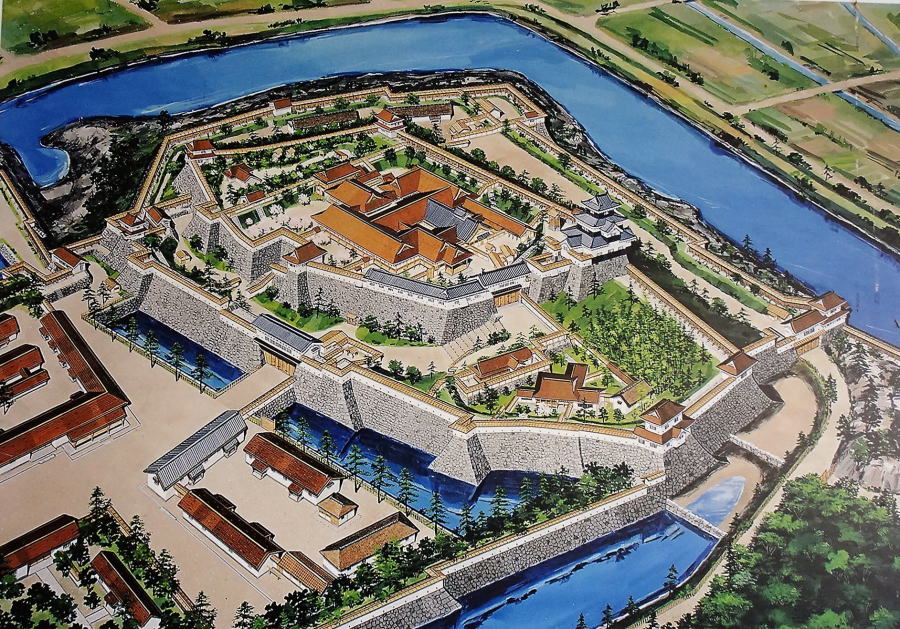 小峰城本丸周辺復元想定図(日本建築研究所蔵) ![]() (現地説明板より) |