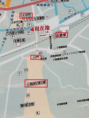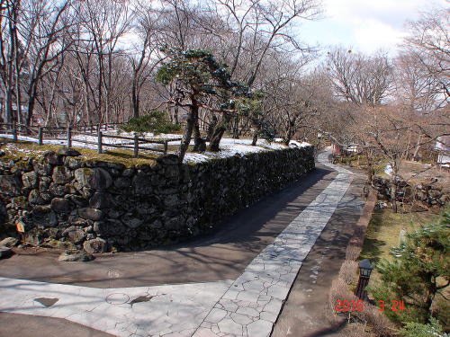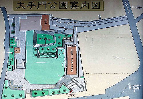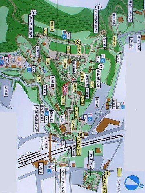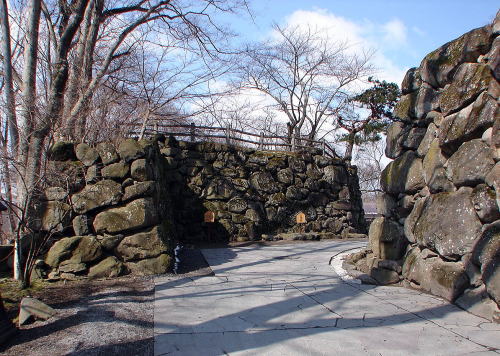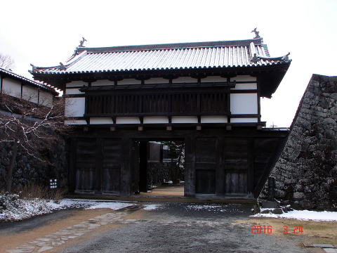 ■小諸城跡は、懐古園という史跡公園となり、その表口には「三の門」が現存。少し離れた市街地(三の丸跡)には大手門が残されている。小諸城と城下町は、かつての信越本線、現在のしなの鉄道によって南北に分断され、大手門は現在、周辺が公園化され史跡らしい景観となっている。![]() |
