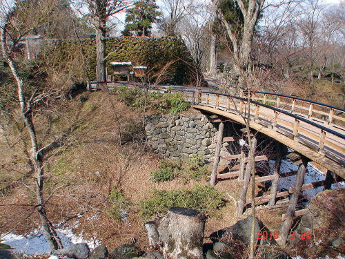 ![]() 黒門橋 北の丸(橋の手前)と本丸(橋を渡った所)の間にある空堀に架かる。緊急の時橋げたを取りはずすことができる太鼓橋が架かっていた。 |