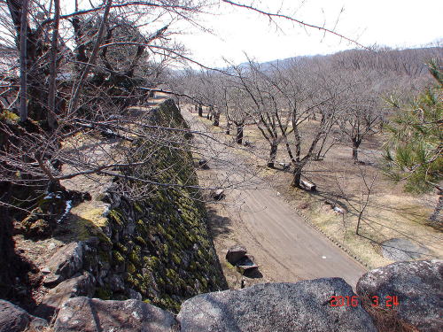 ![]() 天守閣跡から望む馬場跡 本丸を囲む石垣の右手に広がる馬場跡は、往復するだけの鉄砲馬場といわれ、今は桜の名所。 |