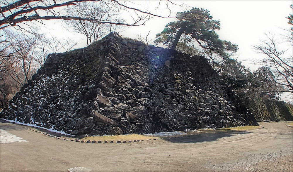 ![]() 天守台 本丸北西隅にある織豊期の算木積みの天守台石垣。この上にかつて三重天守が建っていた。天守台は本丸から北西に張り出した配置になっている。天守台右側奥の石垣群は、本丸を囲む石垣。 |