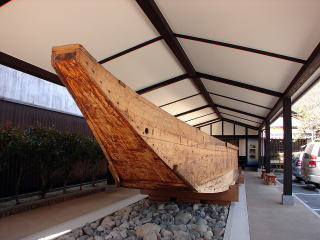 ▲観光駐車場に展示の復元された高瀬舟