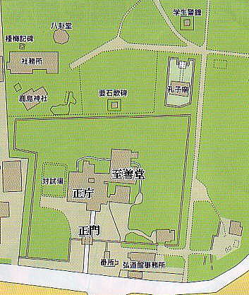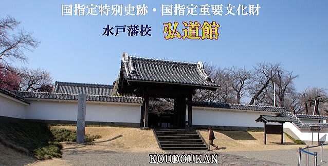 | ●弘道館は、水戸第9代藩主徳川 ●水戸藩第2代藩主徳川光圀(義公)は、藩士の教育のため、藩校の建設を計画したが、大日本史編さんのため多忙で果たせなかった。この意志を第9代斉昭(烈公)が継ぎ、開館したものである。 ●当時の面積は、現在の旧県庁舎、県立図書館、三の丸小学校などを含めて、現在の敷地の約5倍もあり、文武両道はもちろん医学、薬学、天文学さらには蘭学まで幅広い学問が取り入れられ、総合大学とでもいうべきものであった。徳川幕府の最後の将軍となった徳川 ●弘道館は幕末の弘道館の戦い(1868年・藩の中で考え方が違う人達の間で起きた戦争)および、1945年(昭和20年)の戦災によって多くの建物を失うが、かろうじて正門・正庁・至善堂(いずれも重文)が残る。 |