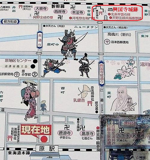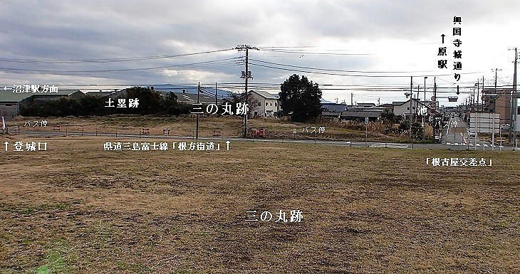 興国寺城跡周辺空中写真(現地説明板より)![]() 説明板の経年変化により画像が不鮮明です。三ノ丸跡を通称「根方街道」が東西(左右)に横断し、三ノ丸跡は南北に分断。 バス停は登城口そばにあり訪城には便利です。現在地には、城跡説明板、パンフレットがあり、北条早雲碑も建っています。 |