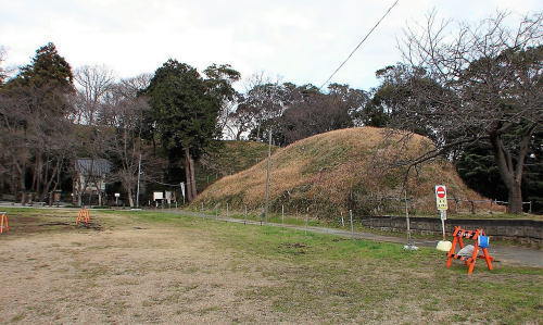 ![]() 二の丸跡 樹木手前の芝生一帯(二の丸跡)はかつて空堀が築かれていたようです。なお、樹木後方は伝石火矢台といわれる所です。 |