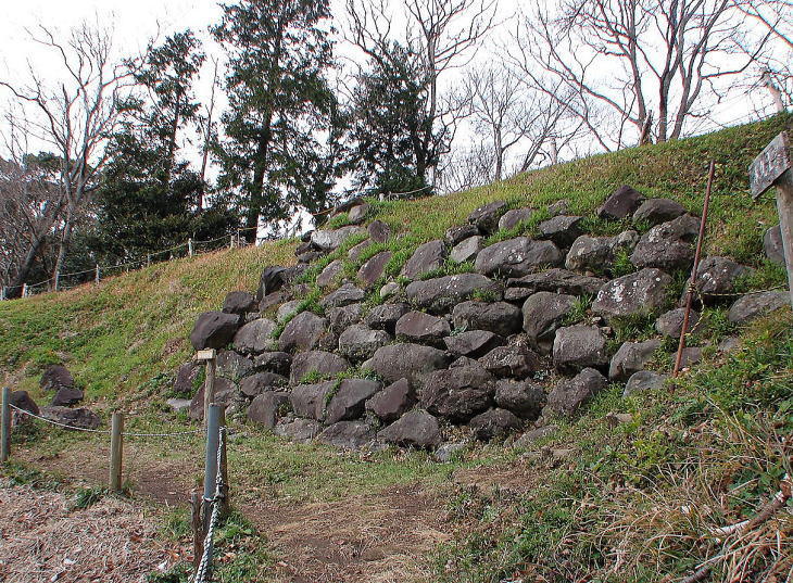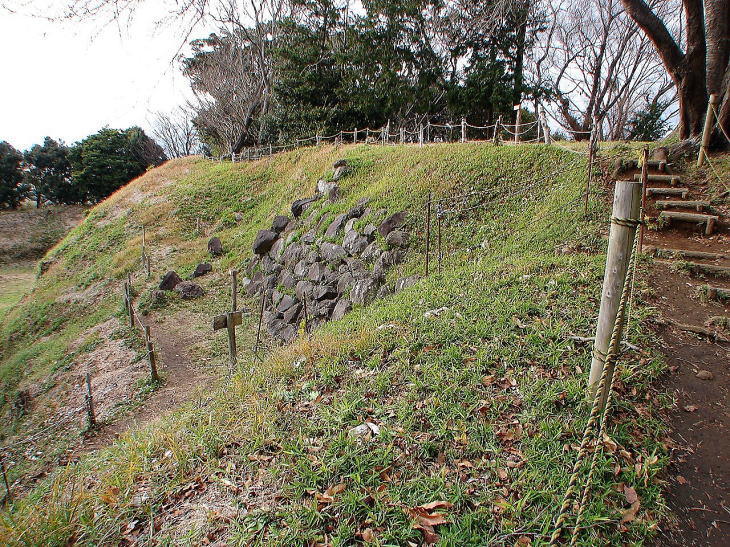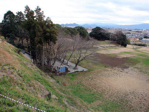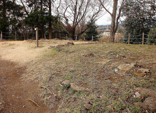 ![]() 本丸北側の土塁 南面中央には石垣が積まれ、上面は伝天守台と呼ばれる平坦部になっている。土塁西端(左端)は西櫓台と呼ばれている。 |