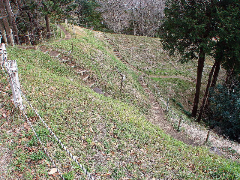 ![]() 本丸東側の土塁 当時は、手前の平坦部にも土塁、空堀が築かれていたが、現在は崩されている。本丸は四方を土塁によって囲まれていた。 左手の北側土塁下には、神社、城跡説明板、北条早雲碑などがあります。 |