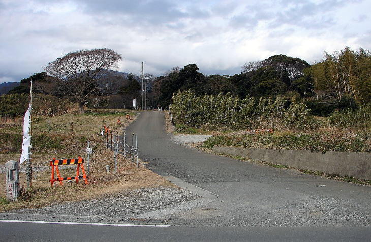 ![]() 県道沿い三の丸跡のこの場所が登城口。この道を真っ直ぐ進むと二の丸跡、本丸跡に至る |