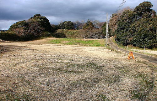 ![]() 県道で南北に分断された三の丸跡。土塁が部分的に残り、交差点そばの池は掘跡 |