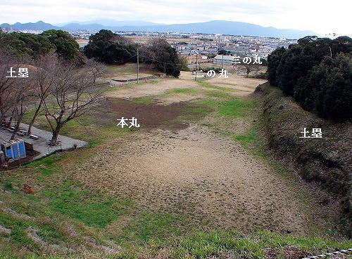 【縄張】連郭式![]() 北(手前)から南(奥)へと、本丸・二の丸・三の丸の曲輪が続く、連郭式縄張りによって造られている。 【城地種類】平山城 【築城年・築城者】不明 【遺構】曲輪(本丸、二の丸、三の丸) 堀 土塁 【主な発掘調査の成果】 ■本丸虎口と北曲輪虎口(現在は新幹線で消失)の南北2か所で、三日月堀と土塁、空堀で構成される丸馬出を検出。 ■伝天守台の建物礎石、本丸石組水路 ■三の丸で柱穴群、北曲輪では空堀を検出。 今後、復元整備を行う予定。 |