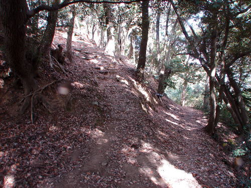 ![]() ▲頂部郭(砦)跡①②③への登り口 右の道は井戸跡へ、さらに頂部郭(砦)跡の北側石垣②へと通じる。 |