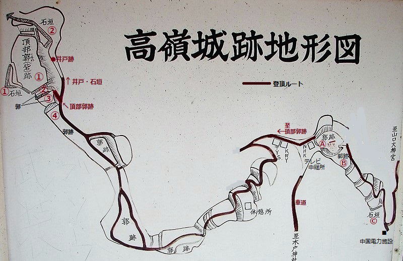 高嶺城跡地形図(現地説明板地形図に追記、消却し引用)![]() |