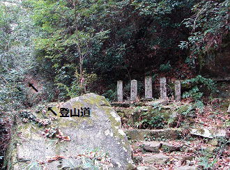 ![]() 高嶺城跡への登山口 縄で囲った石が籾置石で、この奥から城跡へ向かいます。「鴻ノ峰登山口」の標識があり、中腹の岩戸社まで参道石段を登ります。 |