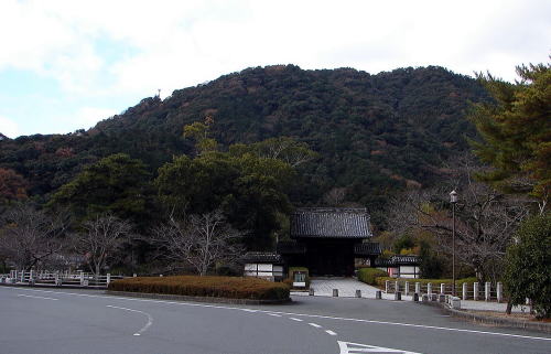 (写真)県庁の敷地内に建つ旧山口藩庁門と後方は高嶺城跡高嶺城は、大内氏最後の当主大内義長(おおうち よしなが)が毛利氏の侵攻に備えて弘治2年(1556)に築いた城です。翌年、義長は形勢が不利となり長門国(下関方面)に逃れましたが、4月、長府の長福寺(現在の功山寺)で自刃しました。義長が去った後、毛利氏は城の改修をし、市川経好(いちかわ つねよし)を城番として置きました。永禄12年(1569)に大内輝弘(てるひろ)が山口に攻め入った際に、毛利勢はこの城の守りを固めて寄せ付けなかったといわれています。 元和元年(1615)、徳川幕府から一国一城令が出されたため、毛利氏は萩指月山城を残し、山口高嶺城、長府串崎城、岩国横山城を破却することとしました。寛永15年(1638)高嶺城は廃城となりました。高嶺城跡のある鴻ノ峰(こうのみね)は標高338メートルの丘陵です。城跡は頂上の主郭を中心に、四方に伸びる尾根に曲輪群が広がっています。主郭やその周囲の曲輪には石垣が巡らされ、礎石や瓦片が発見されています(現地説明板より) |