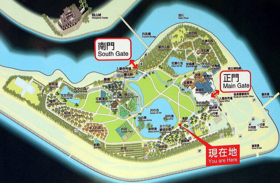 | 「岡山後楽園案内図」(所在地=岡山市北区後楽園) |