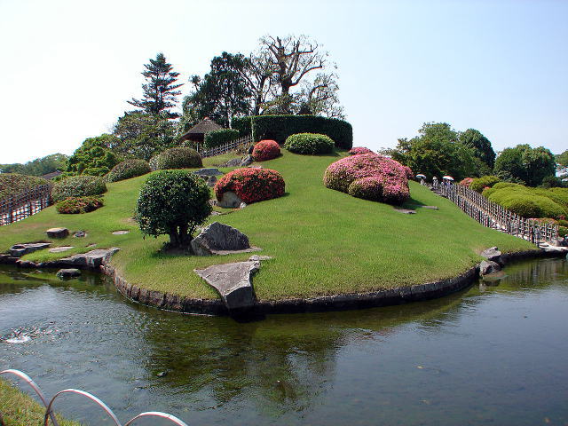 後楽園内で一番大きな池「沢の池」と、築山の「唯心山」