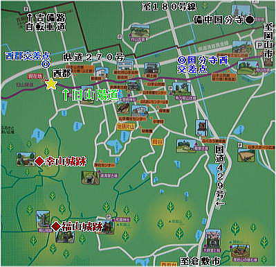 【歴史】幸山城は別名を甲山城または高山城ともいう。福山の北登山道の中腹から分かれた山塊(標高162m)に立地している。三方は、20m以上の絶壁、眼下に旧山陽道を望む要衝の地である。鎌倉期の後半頃、庄四郎資房によって築城されたといわれる。