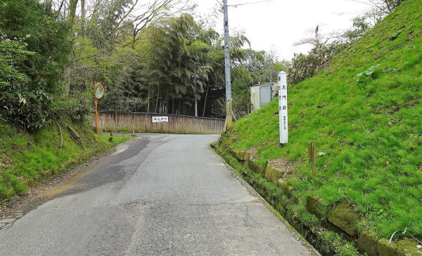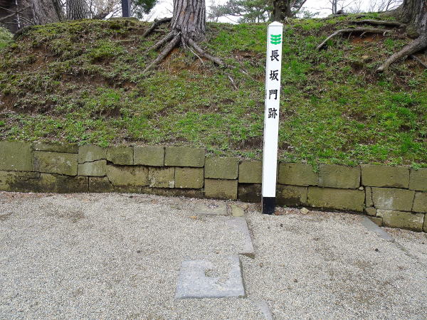 ![]() 長坂門跡 長坂を上がり右折れすると長坂門跡。二の丸から本丸に入る長坂の途中にある。 |