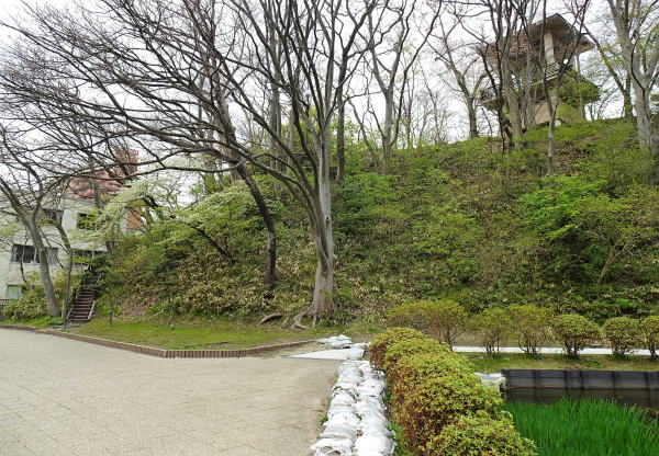 ![]() 土塁 左の建物が秋田文化創造館。右の高い建物は高校。文化創造館(中土橋を渡った右側の建物)の敷地は久保田城三ノ丸(下中城)にあたり、敷地内に残っている土塁は、城下からの登城ルートを抑える中土橋門に連なる防御施設です。 <次は中土橋通りから内堀跡、鐘楼、松下門跡を巡り、黒門跡に行きます> |