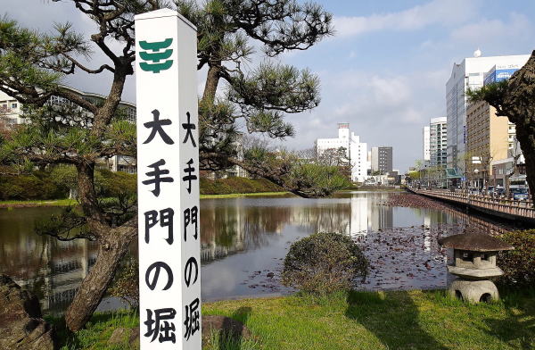 ![]() 広小路 堀沿いのこの道は「日本の道100選」に選定。この道を真っ直ぐ行くとJR秋田駅です。左の堀は大手門の堀。 |