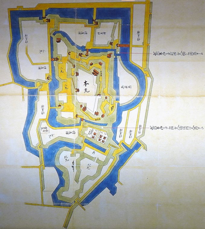 【縄 張】<出羽国秋田居城絵図(御隅櫓にて撮影)>11代義睦(よしちか)が弘化4年(1847)3月に幕府へ提出した土居崩れの箇所の修復願いです。この絵図から当時の城内の建造物の配置がよくわかります。線引きは、その修復箇所を示しています。 【主な遺構】御物頭御番所、本丸、二の丸、土塁、石積、水堀 ![]() ▲御物頭御番所(唯一の現存建物) ![]() ▲長坂門跡の土塁と石積 |