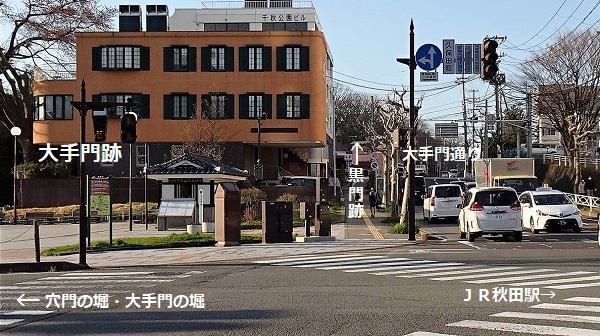 ![]() 大手門跡 ここから黒門跡まで、大手門通りを進むと数分ですが、その前に穴門の堀、大手門の堀、中土橋門跡、土塁、内堀跡、鐘楼、松下門跡を巡ります。 |