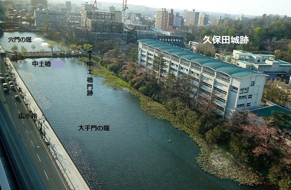 ![]() 穴門の堀・中土橋門跡・大手門の堀(高層ビルより) 千秋公園入口にある水堀。写真下側が大手門跡、JR秋田駅方面。 |